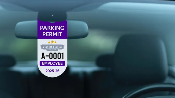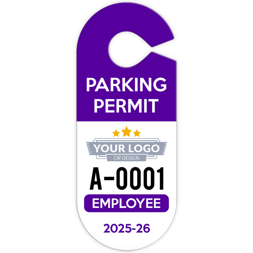 Customize oval hang tag parking permits with your logo, text, and colors. Made from durable 30 mil plastic for easy identification and long-lasting use. Start designing today!